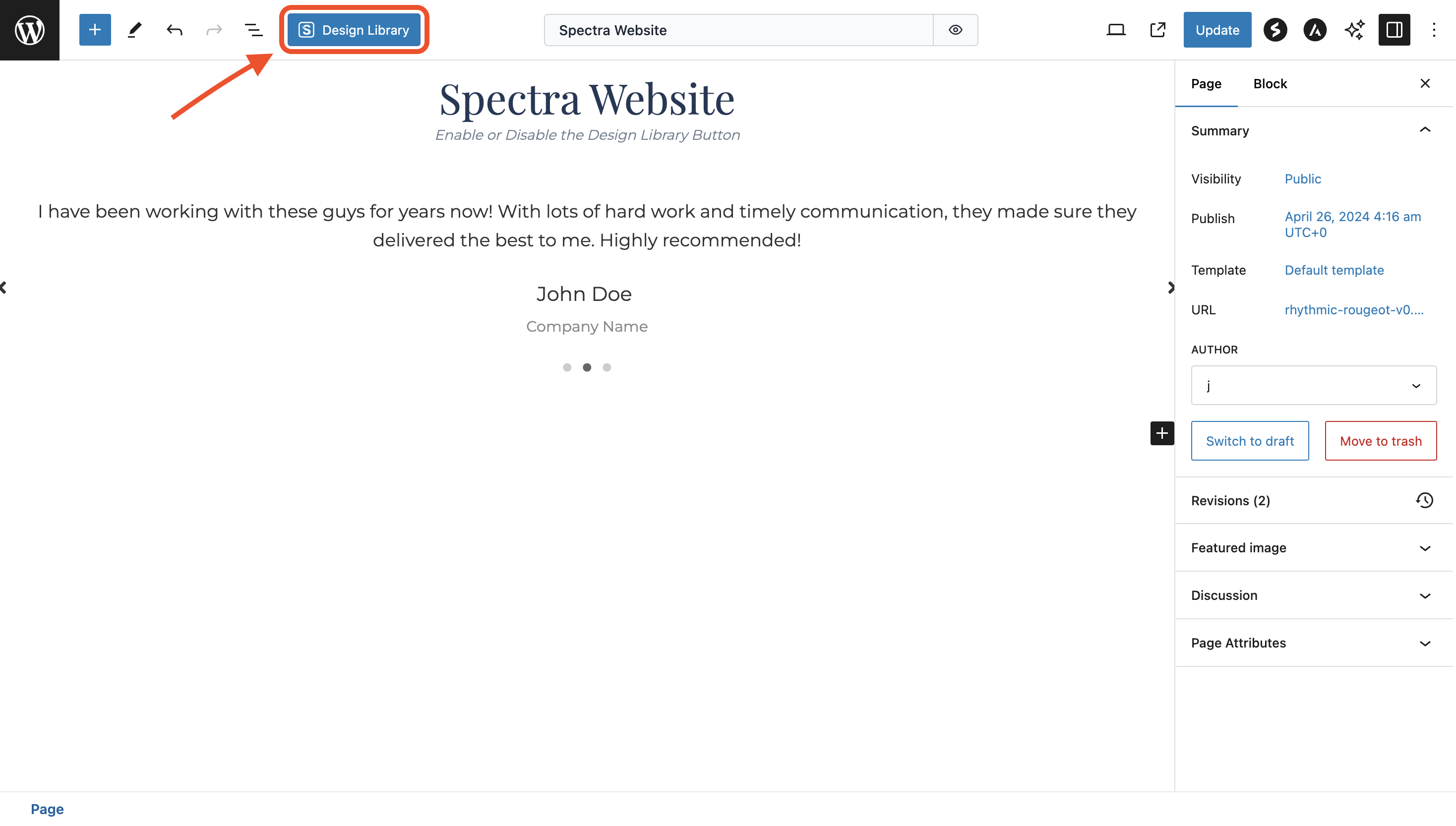 • If this option is enabled, you will see the ‘Design Library’ button in the block editor on the top of every page and post.