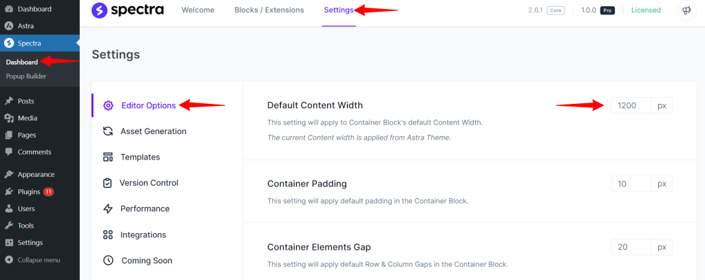 Example: Let us assume you are using the Astra theme, and you set the container width to 1200px. If you want to override the Astra default container width, go to Spectra > Dashboard > Settings > Editor Options > Default Content Width, set the width to 1300px (example).